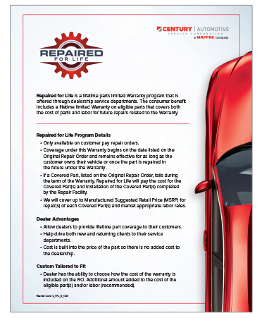 Repaired for Life is a lifetime parts limited Warranty program that is offered through dealership service departments. The consumer benefit includes a lifetime limited Warranty on eligible parts that covers both the cost of parts and labor for future repairs related to the Warranty.
